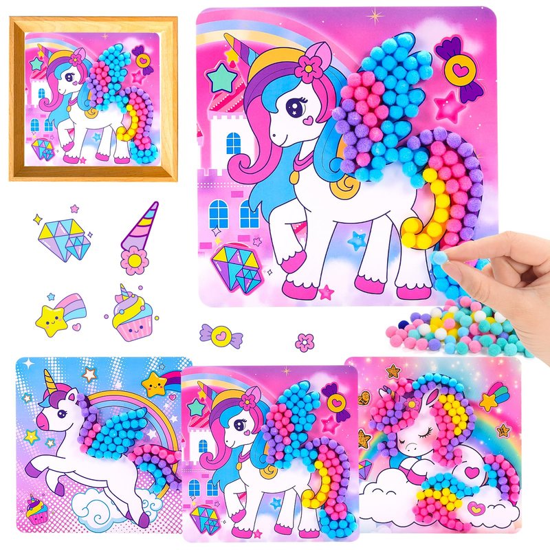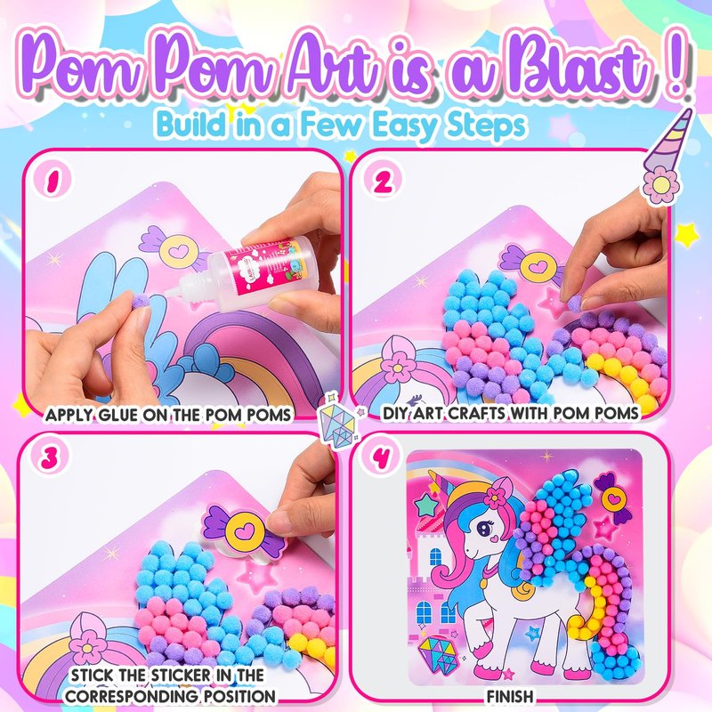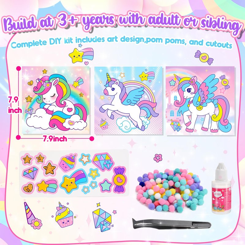 Windidi Girls Gifts Pom Pom Crafts 3PCS 7.9-Inch, Pom Pom Art Kit & Crafts for Kids Ages 2-4 4-8 6-8, Toddler Crafts Kits Art Projects, DIY School Supplies Kit, Birthday Christmas Gifts (Unicorn Set)
