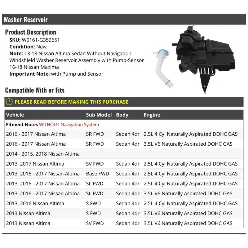 Windshield Washer Fluid Reservoir Tank Assembly - with Pump and Sensor- Compatible with 2013 - 2018 Nissan Altima Sedan 4-Door