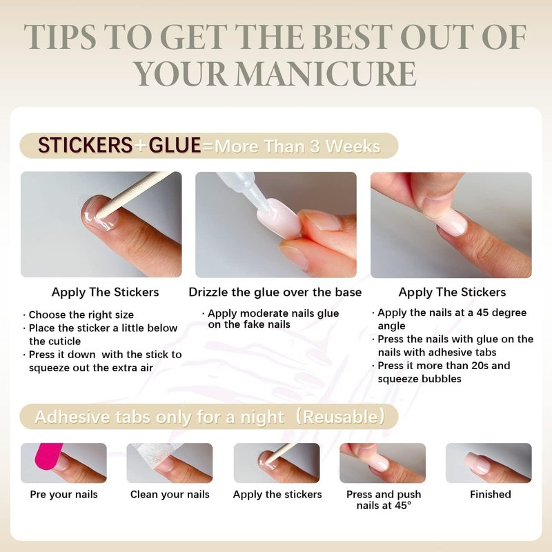 2.Please note that the nail glue is not included.If you want it last for a longer time,please use nail glue instead of the nail stickers.