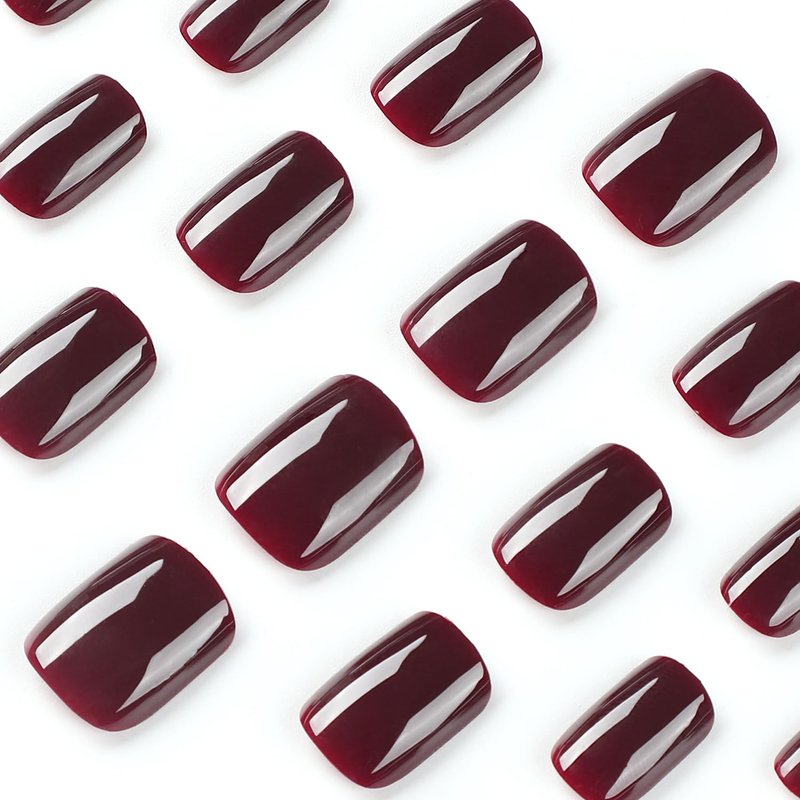 24 Pcs Short Square Press on Nails SWEKKE Fall Fake Nails Full Cover Dark Red Solid Color Glossy Glue on Nails