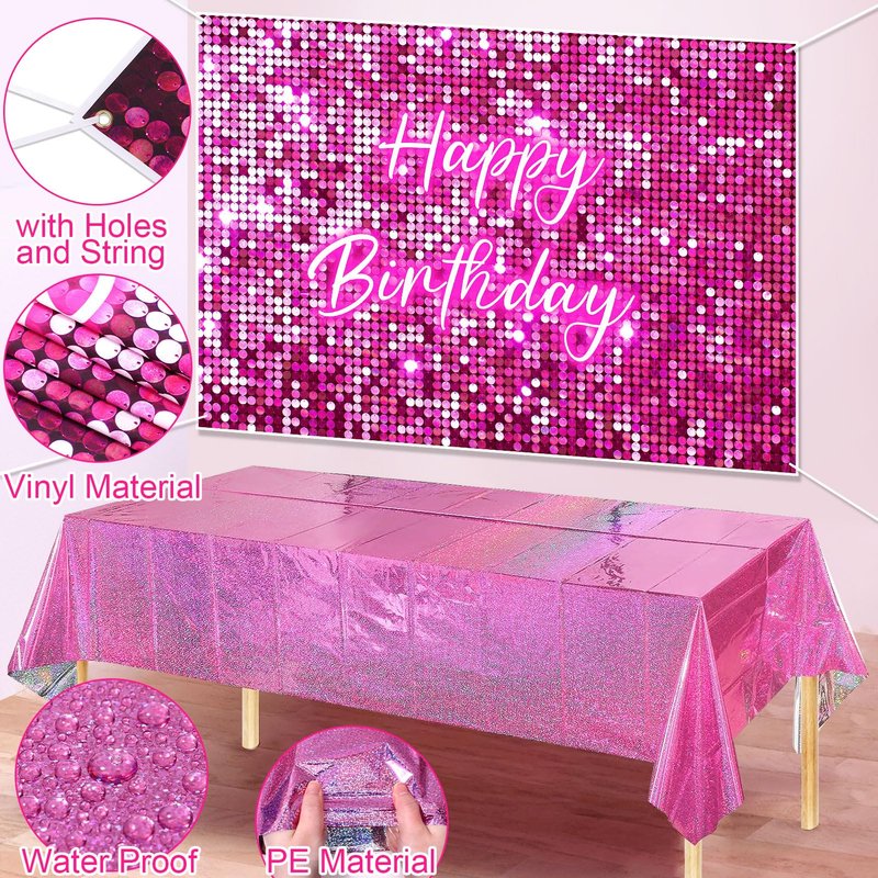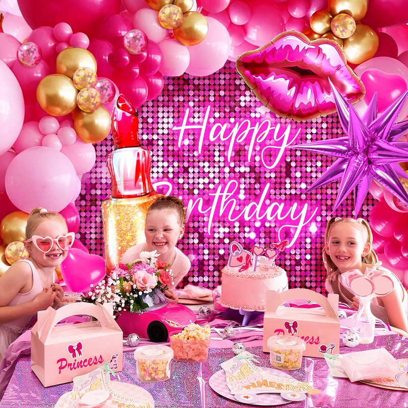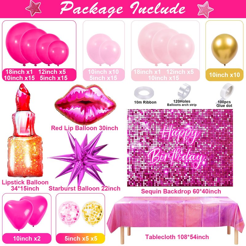 - Hot Pink Birthday Party Decorations - We have carefully prepared a set of pink birthday party decorations. It includes 102 latex balloons (5"+10"+12"+18", 3 colors, with sequin balloons), 4 large foil balloons (lipstick, lip, heart, starburst), 1 sequin birthday backdrop, 1 laser tablecloth; and balloon accessories (glue points, balloon chain, ribbon). The rich and complete accessories can fully meet your needs, suitable for girls or women of any age, let's enjoy the party feast together
