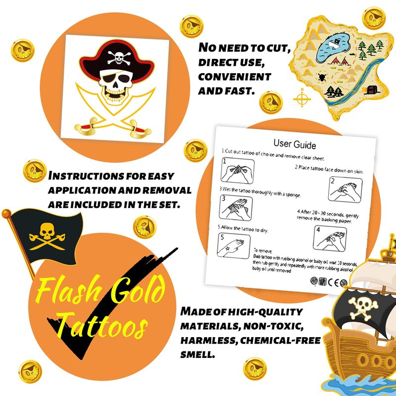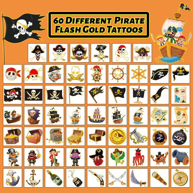 - 60 Flash Gold Designs: Different types of pirate tattoo designs, creepy but cute, includes skull, pirate ships, crossbones, treasure, and other pirate elements.The surface is added with flash gold designs, glittering details perfect for boys and girls of all ages.