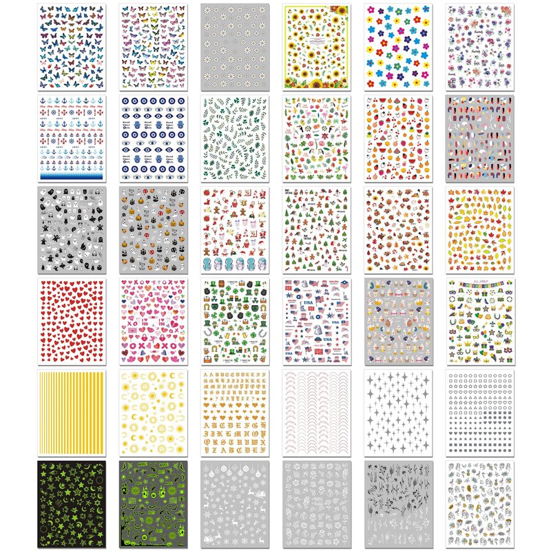 36 Sheets All Holidays Mixed Seasons Nail Stickers (Halloween, Christmas, Thanksgiving, Valentine's Day, Independence Day and other major festivals. Daisies and green leaves in spring; butterfly and sunflowers in summer; maple leaves and pumpkins in autumn; snowflakes and snowmen in winter etc)