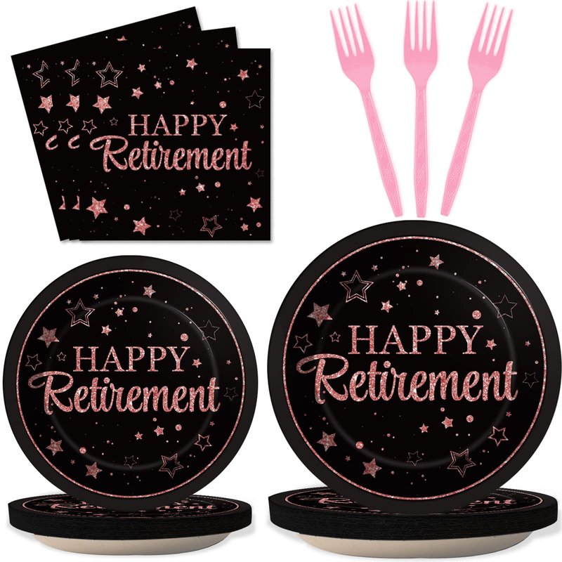 - 【Vibrant Retirement Party Design】Except for the fork, this retirement theme party tableware set is all designed in rose gold vibrant happy retirement patterns. Decorating your retirement party with these tableware kit can make your party full of the festival atmosphere.