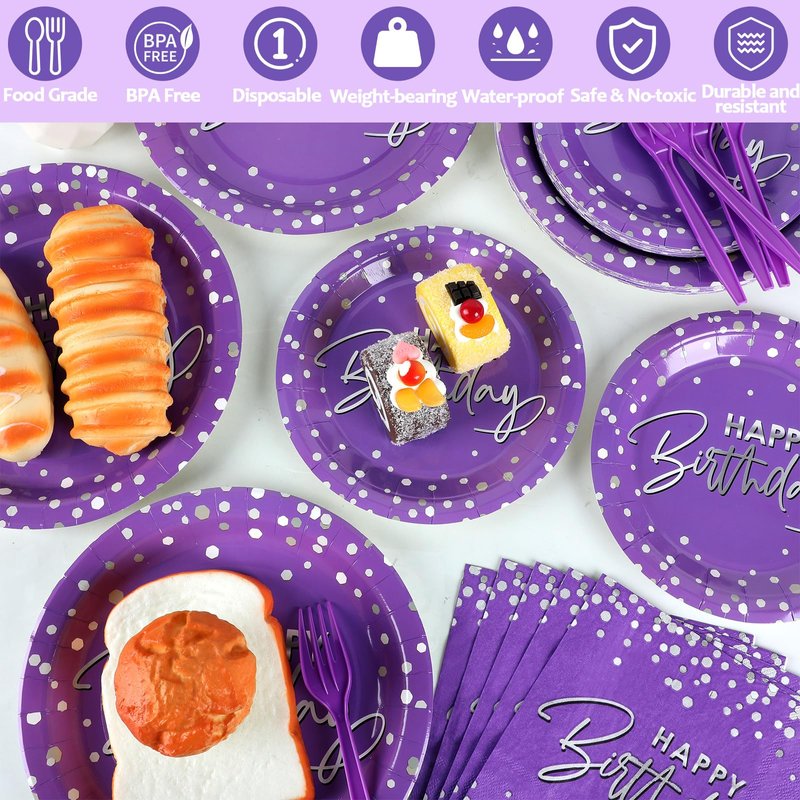 - What you will get: The package comes with 24 sets of purple silver birthday party tableware sets supplies, including 24pcs 9inches birthday paper dinner plates, 24pcs 7inches purple paper dessert plates, and 24pcs happy birthday paper napkins(About 6.5 x 6.5 inches folded, About 13 x 13 inches unfolded), and 24pcs of plastic forks, totally 96pcs, each set serves for 24 guests. Sufficient quantities are enough for your happy birthday party.