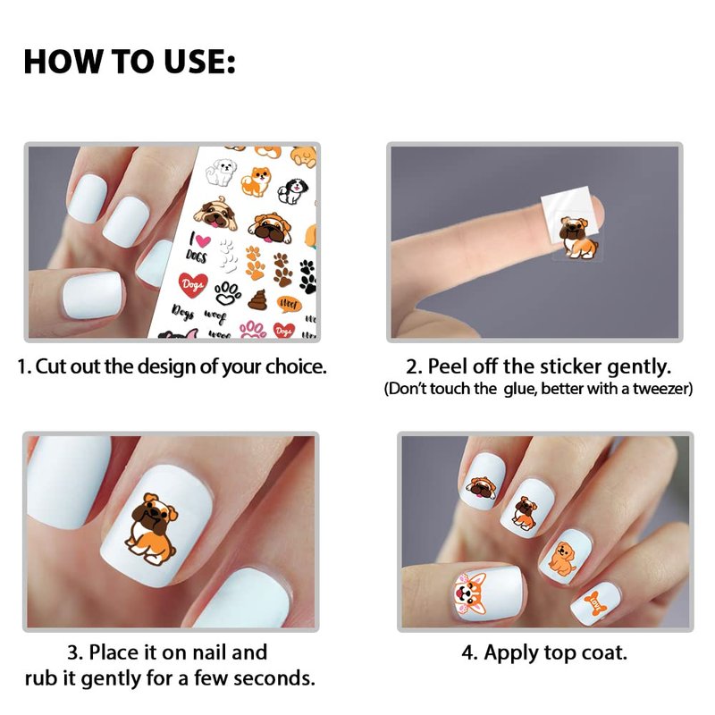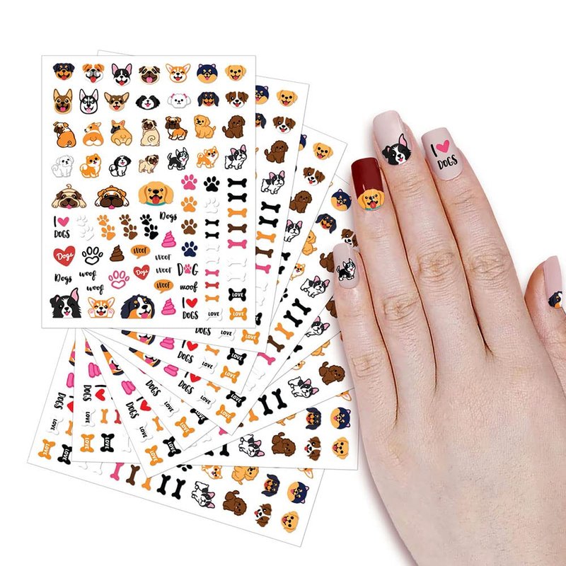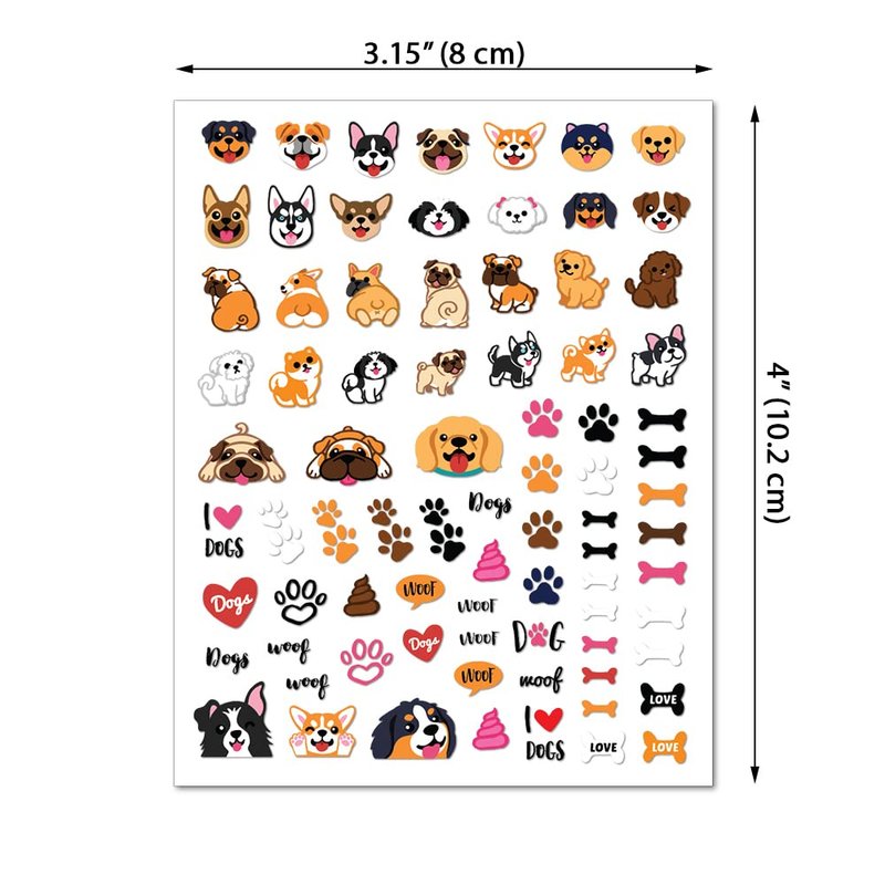 - DIMENSION: Each sheet of nail stickers approximately measures 4 x 3.15 inches (10.2 x 8 cm), includes 80 cute stickers (Rottweiler Dog, English Bulldog, French Bulldog, Pug Dog, Pembroke Welsh Corgi Dog, German Shepherd Dog, Siberian Husky Dog, Jack Russell Terrier Dog, Labrador Retriever Dog, Chihuahua Dog, Shih Tzu Dog, Maltese Dog, Pomeranian Dog, Toy Poodle Dog, Border Collie Dog, Bernese Mountain Dog, Dog Funny Playful Postures, I Love Dogs, Dog Paws, Bones, Woof, Heart)