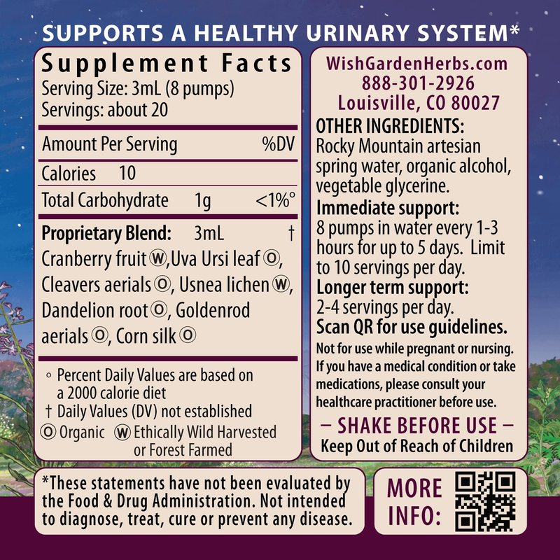 - WOMAN-OWNED & FAMILY RUN SINCE 1979: We are herbalists, botanists, scientists and naturalists making this bladder health supplement for women with cranberry supplement with Usnea Uva Ursi & Cranberry the old-fashioned way, using only the cleanest, most vibrant ingredients for optimal potency, efficacy and safety. WishGarden self-manufactures and distributes each of our liquid herbal extracts in Boulder, Colorado.