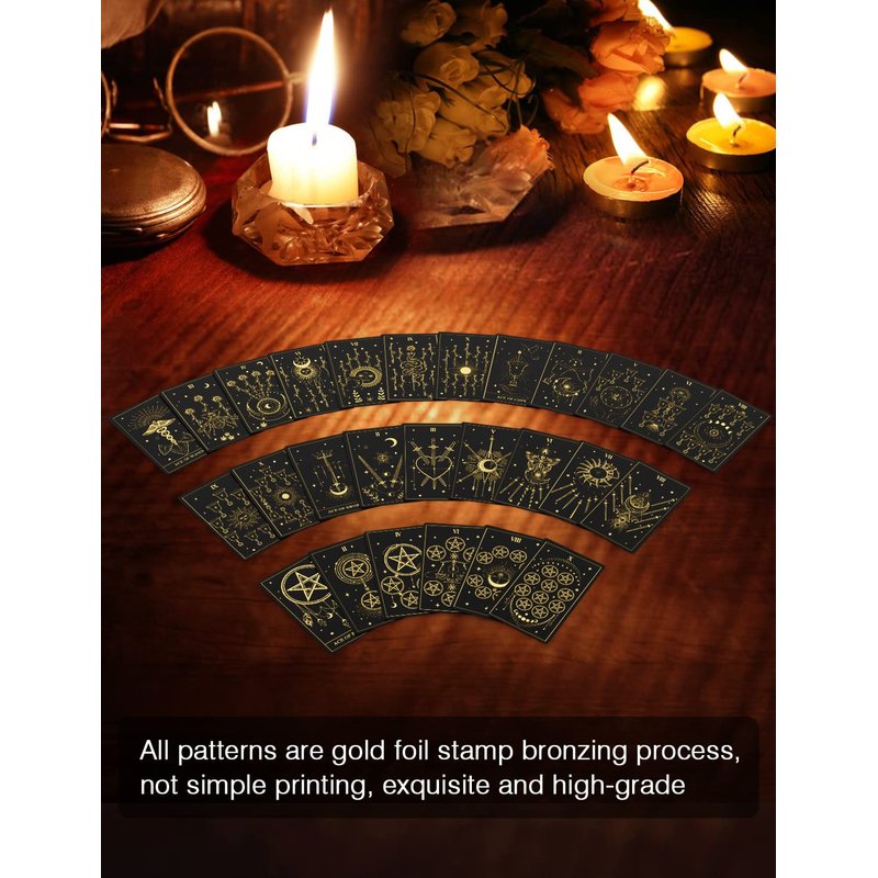 - 2)Every pattern detail is gold foil hot stamping process. High-end gorgeous and exquisite quality. Surface black touch matte rubber treatment, Extraordinary amazing feel, soft and silky smooth. On the front, the 22 big cards are all improved designs by Acelion . The 56 small cards are all original designs by Acelion. At the back, It is a dark night starry sky design, mysterious and dreamy.