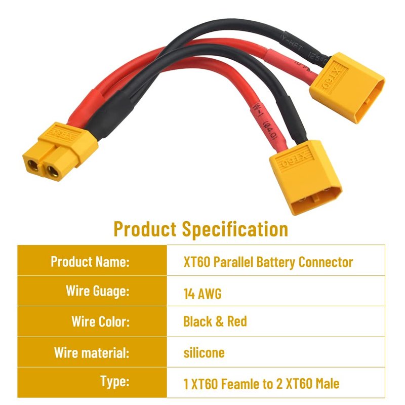 XT60 parallel battery adapter, convenient to use, direct to connect your batteries to xt60 connectors, it is suitable for parallel batteries which have the same specification to ensure its normal use.