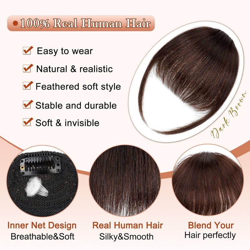 - 🧡100% Human Hair Bangs: High-quality human hair clip in bangs,shiny,soft and fluffy as your own hair. Creating the most lustrous and as realistic natural effects. No tangles, no shedding, no odor,bangs hair clip can be curled, straightened, and you can wash them like shampoo and conditioner.