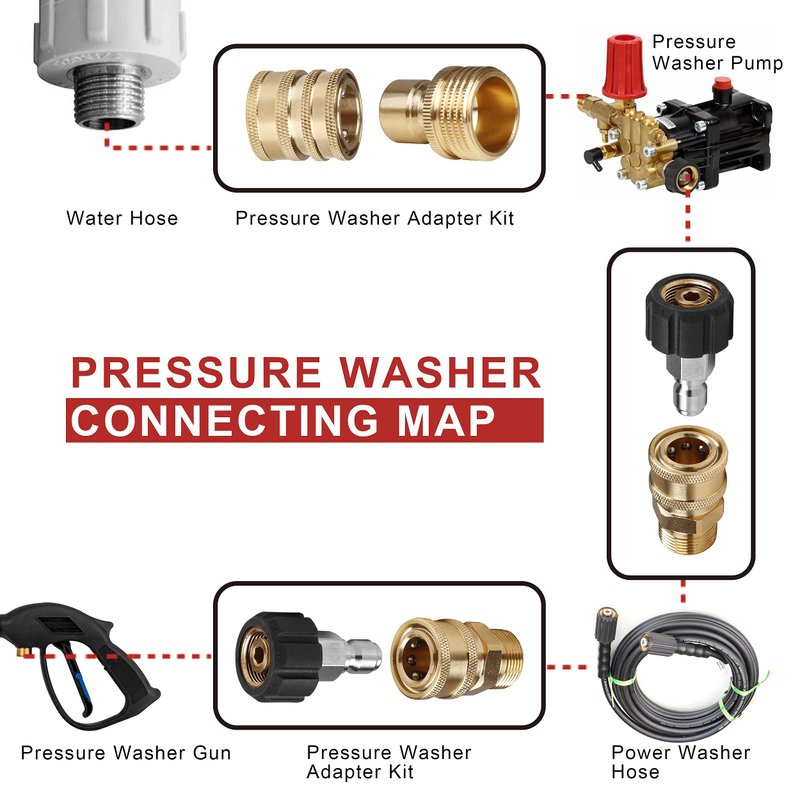 - Easy Connect & Disconnect:Two Quick Connector Sets connect water outlet of pump to pressure washer hose or connect pressure washer hose to gun. The other two Quick Connect Kits converts 3/4'' threads to quick release fittings, connecting all 3/4" standard garden hose to water inlet of power washer pump. And 1pc M22 to M22 connection for easy hose M22 connection, two hoses connection and extension.