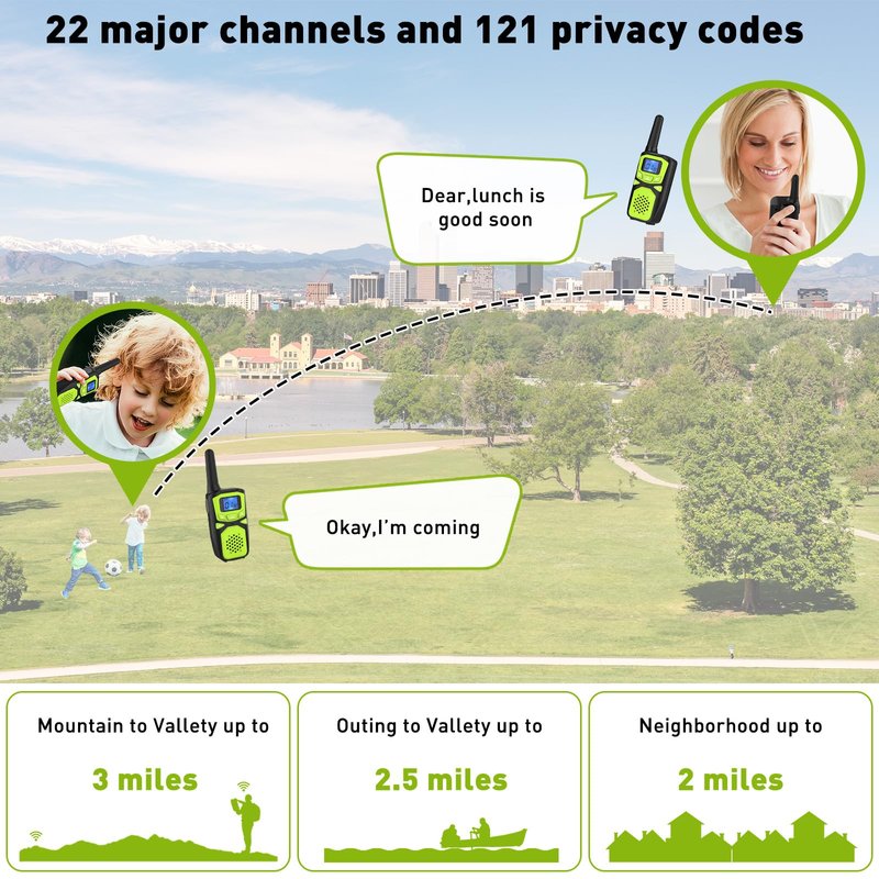 - 【BEST GIFT FOR YOUNG AND OLD】 - Long range kids walkie talkies bring more fun to communicate with your kids, friends and parents. Get ready for outdoor living, hiking, camping, hunting, skiing and biking and stay connected at all times.