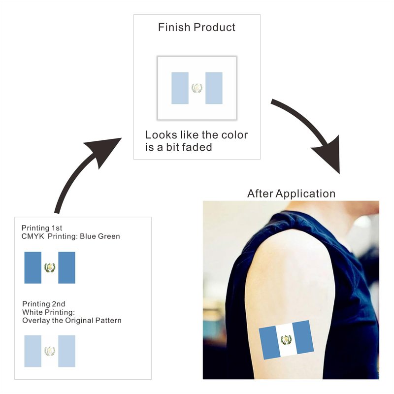 Regarding temporary flag tattoos: Most flag designs include white, such as the flags of the United States, Britain, and Japan. During production, a white print needs to be added to cover the entire pattern, which looks a bit blurry before use and distorts other colors. But it does not affect the use, as the color will become normal after application; Some flag designs do not have white, such as the flags of Germany and Colombia. When producing temporary tattoos for this type of flag, there is no need to print white and bright colors