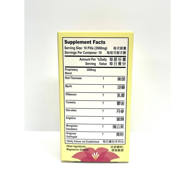 Ingredients: Red Thorowax, Myrrh, Olibanum, Turmeric, Dan-shen, Angelica, Mongolian Dandelion, Nutgrass Gallingale.