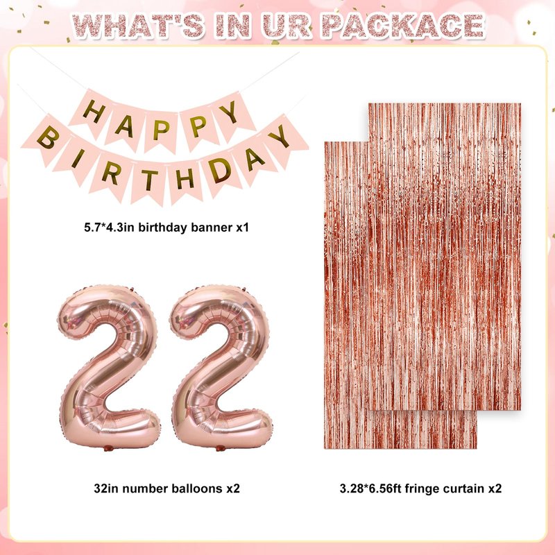- Rose Gold Birthday Decoration Set: Rose Gold Foil Tassel Curtains*2, 32-inch Digital Foil Balloons*2 (Warm Tips: 1-9 years old only has 1 32-inch balloon), Happy Birthday Banner*1, 12-inch Confetti Balloons*12, 10-inch Balloons (Rose Gold*12, Vintage Colors*12) 18-inch Rose Gold Heart Foil Balloons*2, 10-inch Star Foil Balloons*2, 5-Star Tassels Garland*1, Hanging Swirl*6, Cake Topper*1, Balloon Arch Chain*1, 100pcs Balloon Sticky Tape*1 roll, 24-inch Rose Gold Crown*1, Balloon Ribbon*1 roll,