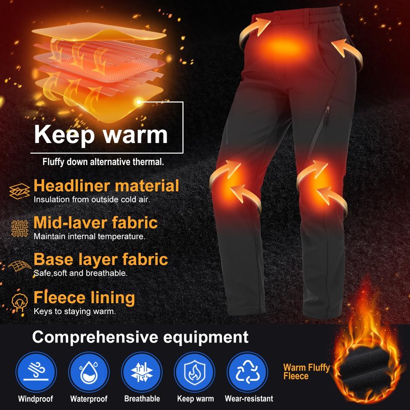 - Waterproof pants womens: The softshell pants inner layer made of warm polar fleece which offers superior next-to-skin comfort, stave of winter winds and chilly temperatures so you stay warm all season long. The classic soft shell surface layer using windproof fabric block the cold air to further improve thermal insulation performance. Both outer and inner are useful for preventing loss of heat from the body, effectively to warm your body even under extreme winter or snowy conditions.
