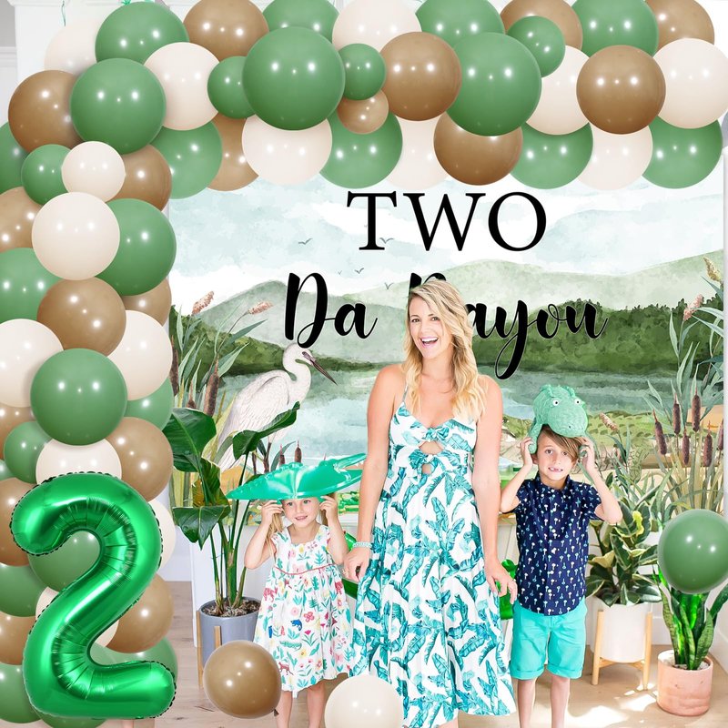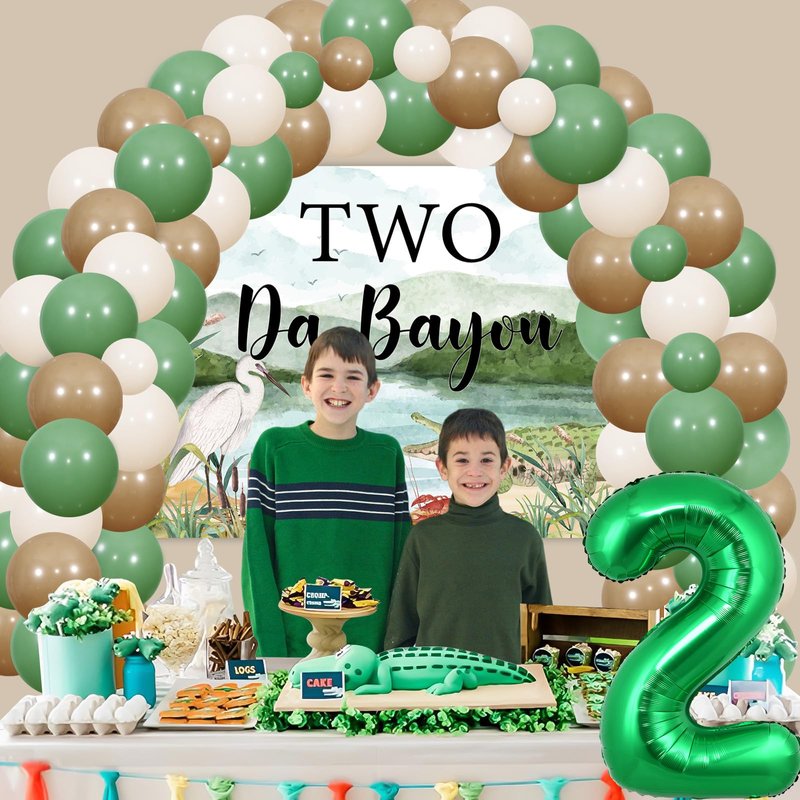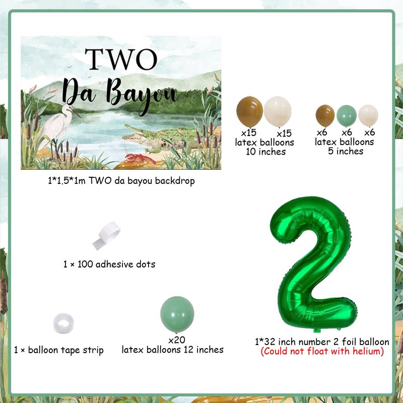 - Two da bayou party supplies:You will get 30*10 inch latex balloons(15*kahaki,15*sand white), 20*12 inch bean green latex balloons, 18*5 inch latex balloons(6*kahaki,6*sand white,6*soybean green), 1*1.5*1m TWO da bayou backdrop, 1*32 inch number 2 foil balloon, 1*103*49cm green crocodile foil balloon, 1*98*78cm big lobster foil balloon, 1*16.4ft balloon tape strip and 1*adhesive dots
