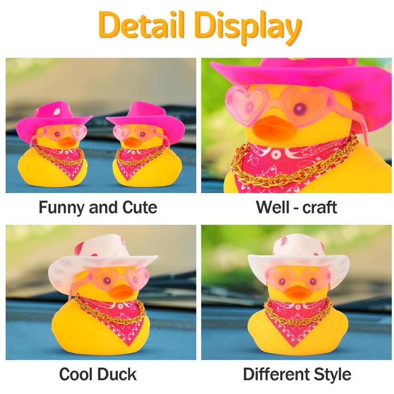 - Funny Car Duck: This car rubber duck features a cute cowboy hat, heart pink glasses, gold necklace, and double-sided tapes. It is interesting that the rubber duck will squeak when you squeeze it.