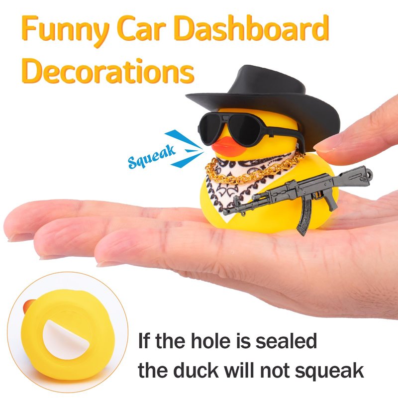 - Funny Duck Car Decorations: These car ducks for the dashboard are equipped with a cowboy hat, bandana, sunglasses,chain,defensive props and double-sided tape. They are unique and ganster ducks designed to decorate the interior or exterior of your car. Whether you choose rubber ducks for your car to place on your dashboard decorations or in other areas of your car, these cute duck accessories are sure to bring a smile to your face as you cruise down the road.