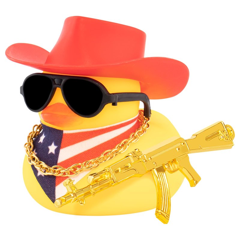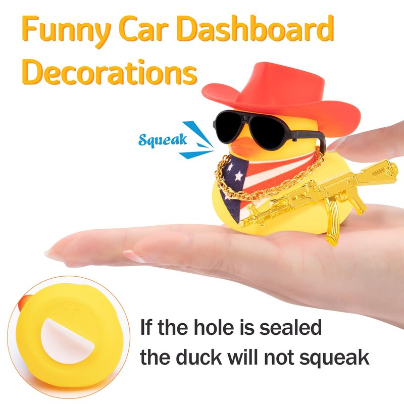 - Funny Duck Ornaments: This America duck is equipped with a cowboy hat, sunglasses, necklace, America Patriotic scarf and double-sided tape, which is a unique and adorable duck to decorate our car.It represents the red white and blue stars and stripes US flag.