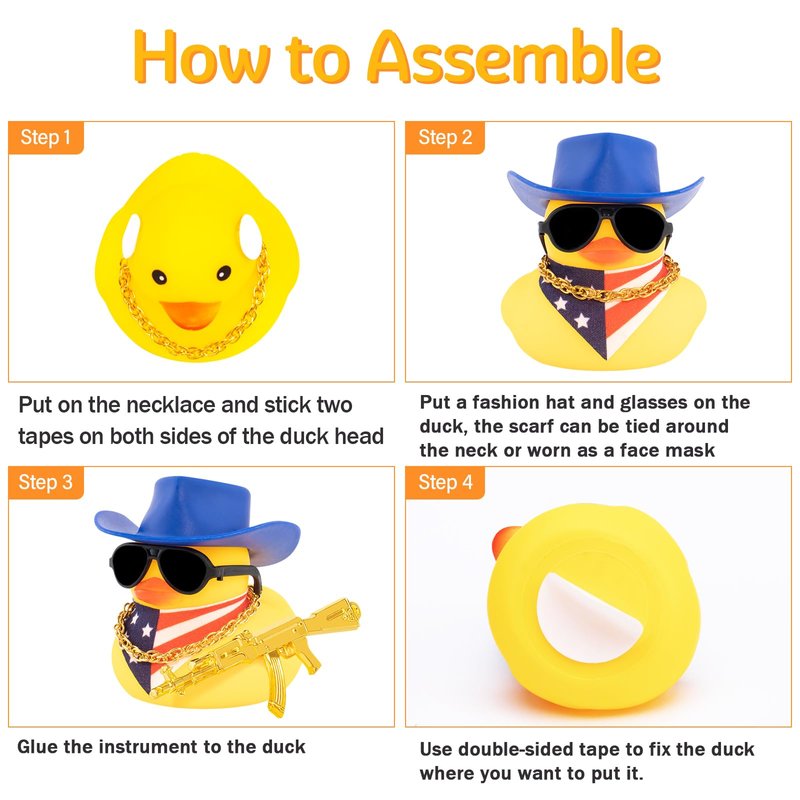 - DIY Duck: Need to assemble, put on the necklace and the glasses, put the cowboy hat on the duck's head, Glue your gear to your side and then fix the duck with double-sided tape. If you have any question, please feel free to contact us, and we will respond to you within 24 hours.