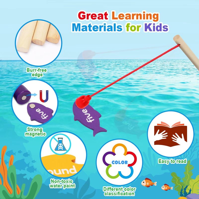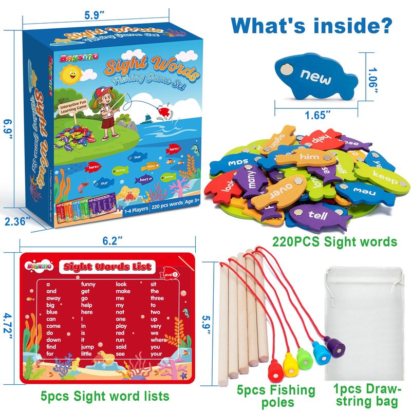 - 220 Sight Words Toddler Fishing Game Set--The magnetic fishing toy comes with 220 wooden sight word wooden fish divided into five levels, 5 sight word cards, 5 wooden fishing poles, and a portable drawstring bag for easy carrying, Fun learning toys for 3-5-year-olds, Great teaching supplies for home, school or on the go.