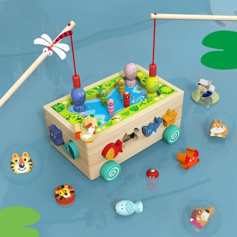 This fishpond fishing building car toy through the simulation of real fishing scenes, let children close to nature, cultivate wisdom, and advocate parent-child interaction. The advantages of this product are that it is educational, material safe, can promote children's understanding of nature, and enhance the intimate relationship between family members. This product is made of high quality wood and is suitable for children over 3 years old.