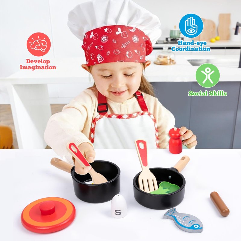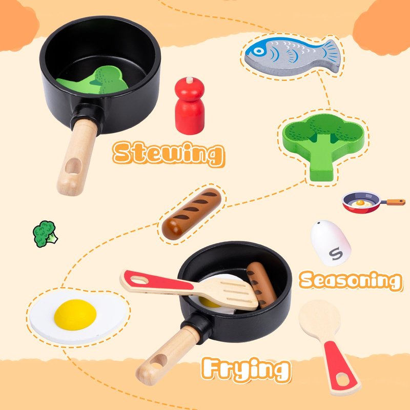 - 【11 PCS Wooden Play Kitchen Accessories 】This wooden kitchen playset contains 11 pieces toys including stock pot, frying pan, pot lid, spoon, spatula, spices, fish, broccoli, sausage and fried egg. Our kitchen toys provide everything you need for a pretend kitchen and could accompany your children throughout their childhood.