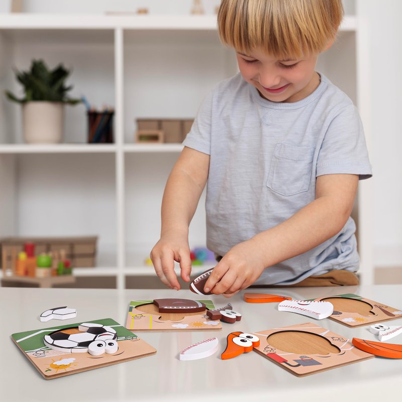 Introduce your little one to the world of sports with our Wooden Sports Puzzles for Toddlers! These Montessori wooden puzzles for boys are the perfect gift for kids ages 18+months - 3. With soccer, baseball, football, and basketball puzzles included, your child will have a blast while developing their fine motor skills and problem-solving abilities. Made from high-quality wood, these durable puzzles are designed to withstand the rough play of toddlers while also guaranteeing your child's safety while at play. With the understanding that puzzles for 3 year old boys need to be strong and durable, we made the extra effort to make sure that we use only great quality material. Wooden puzzles for toddlers 2-4 years (and boy gifts in general) are in high demand, but this sports themed wooden puzzle for kids is truly one of a kind and is considered one of the top gifts for 2 year old boys. Unique toddler boy sports toys can be tough to find but we feel that this 4 pack sports puzzle set covers all the bases and provides for a very exciting gift giving opportunity (especially when searching for toys for 2 year boy). When looking for toddler boy toys 2-3 years of age, look no further! When it comes to sports toys, an educational toy for a 2 year old boy is hard to find (and 2 year old puzzles for boys is even harder to find) but this puzzle set is just that. Enjoy the development benefits from the toddler jigsaw puzzles while also introducing multiple sports to your future all-star.