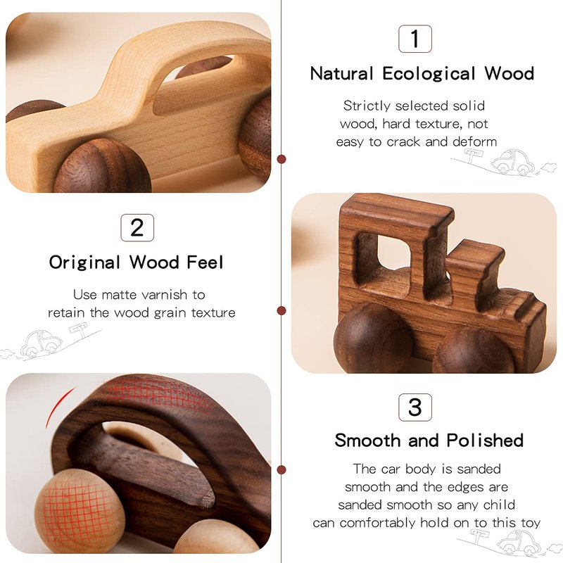 - ✎The car is made of high-quality wood, and the car body is polished by hand. Each edge is shown to the baby with rounded corners, which ensures the safety of the baby and enables the baby to play comfortably.
