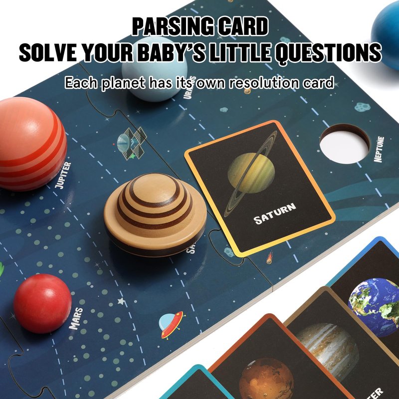 - 【SAFETY TOYS】This set includes 8 * Wooden Planets, 1 * Wooden Puzzle Board of the Solar System, 3 * Resin astronaut statue, and 8Double-sided Solar System Knowledge Education Cards.compliant with international toy standards, and have passed CPC safety tests. The product has a smooth surface, free of burrs and heavy metals, and is harmless to children. You can rest assured to let children play.