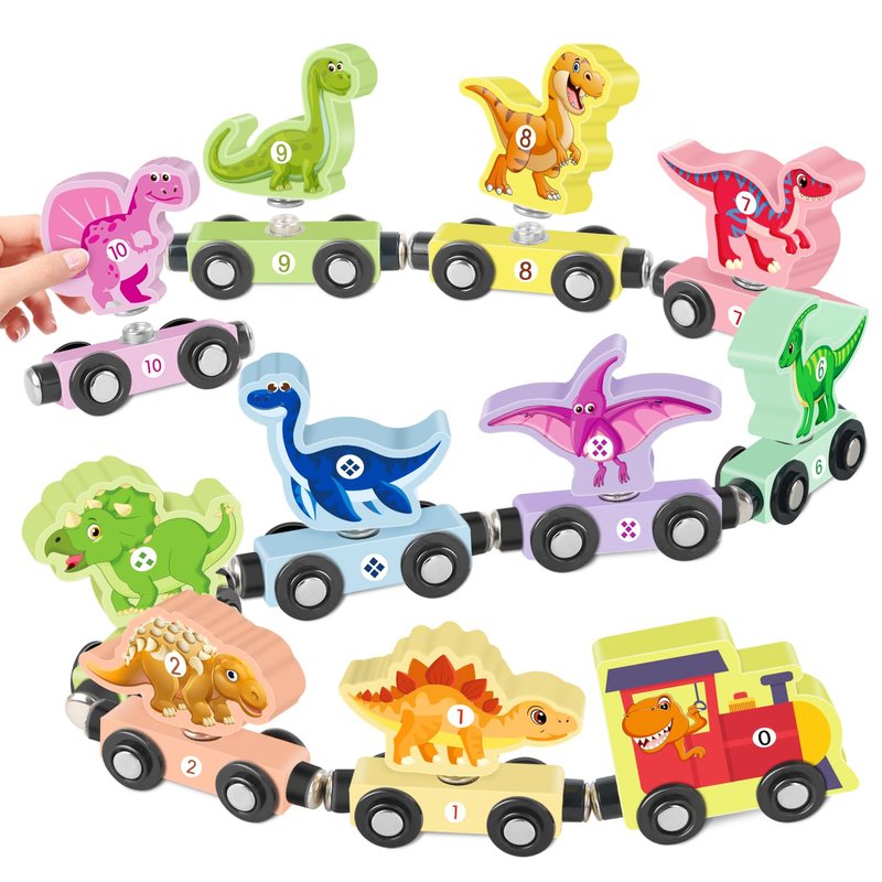 - 11PCS Magnetic Dinosaur Toy Train Set: Our magnetic wooden train toy set includes 1 locomotive (with the number 0) and 10 train carriages (with the numbers 1-10), with 11 different styles of dinosaur patterns printed on both sides in 11 different colors. It will be very popular among children who like dinosaurs. Our train set provides novel matching gameplay ideas to help children learn mathematics, shapes, and colors while improving children's cognitive ability and problem-solving abilities