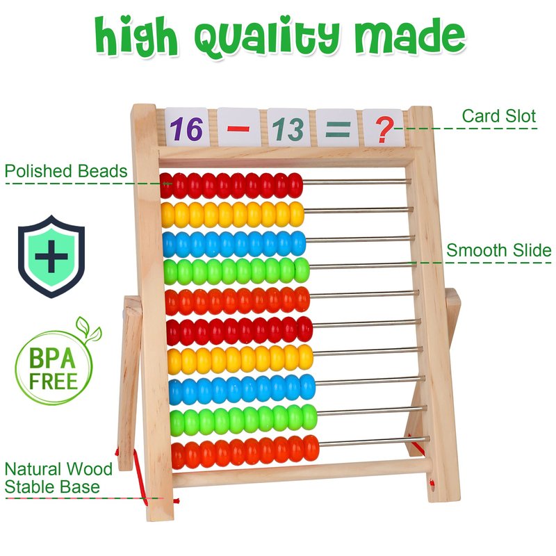- 【Abacus for Toddlers 3-5】This classic colorful wooden math toys for kids includes 100 counting sticks,80 cards of letters, numbers and symbol, and 1 Addition/Subtraction/Multiplication/Division Table, which is a very useful teaching tool for children to learn the four arithmetic operation,help kids learn the number and decimal system systematically