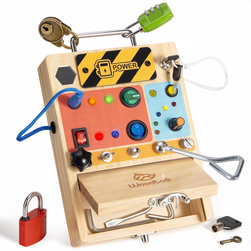 - Rich Accessories: The sensory board includes 1 wooden box, 6 different switches, 10 LED lights, 5 screws of different shapes, 2 screwdriver tools, 3 unique locks and keys, and a product guide. The wooden busy board helps develop children's hands-on abilities, hand-eye coordination, and fine motor skills. Not include AAA batteries! (Green lock code: 000)