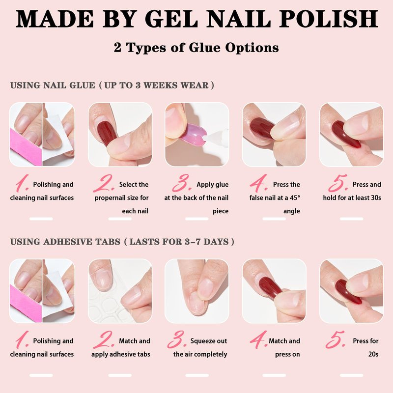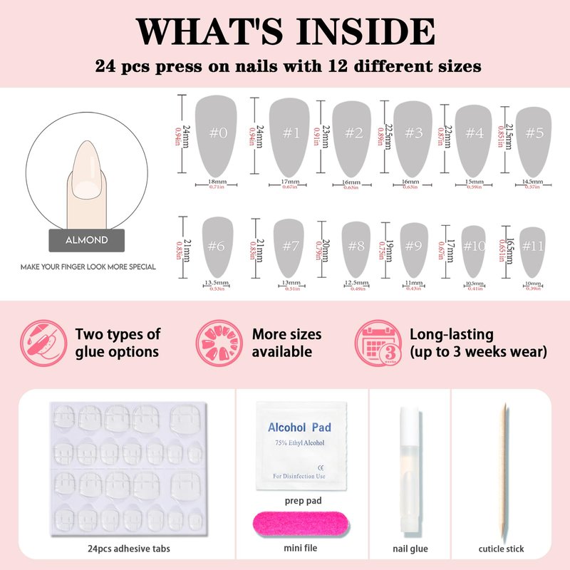 - ✨Convenient & Durable: Say goodbye to time-consuming salon visits. These almond press on nails are quick and easy to apply in just 5 minutes. With proper care, they last 1-2 weeks, and even longer when used with glue. Ideal for DIY at-home manicures or last-minute emergencies! It's the perfect Valentine's gift choice for woman girls.