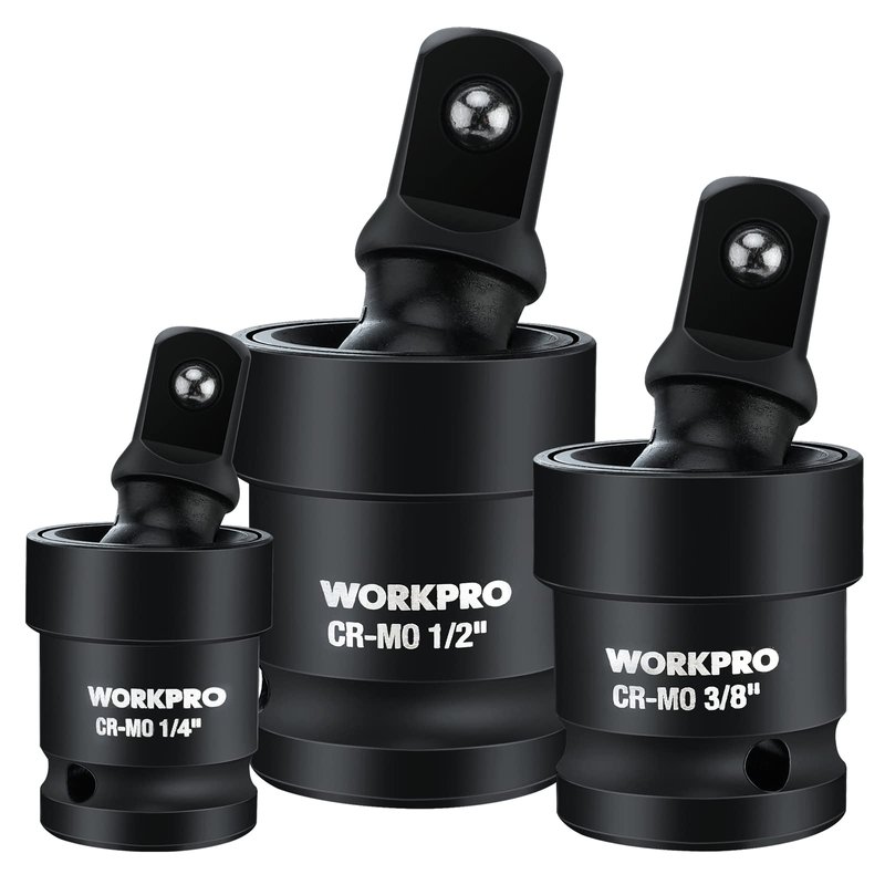 WORKPRO Impact Universal Joint Set, 3 Piece-1/2", 3/8", 1/4"Inch Drive Swivel Socket Set, Socket Adapter Set, Premium CR-MO Steel, Impact Grade, 360 Degree Rotation for Various Angles