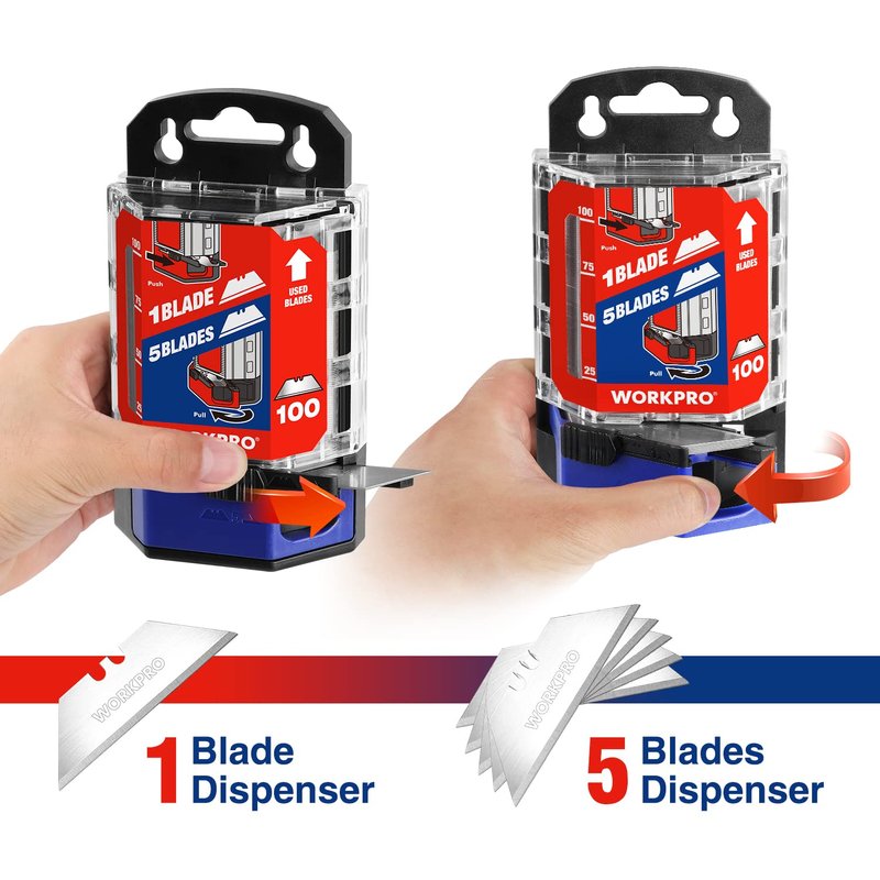 - 2 Handy Dispensers: Push the black button to take 1 utility blade, and pull the bottom to take 5 utility blades. Safely take 1 or 5 utility blades at one time from different positions, meeting your various needs. Dispensers made of durable plastic, 100 refill razor blades included for long-lasting use.
