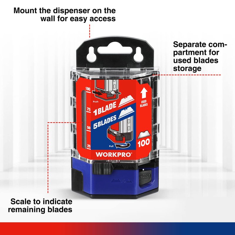 - Innovative Designs: With 3 holes, the compact blade dispenser can mount on the wall for easy access. The scale on the side of the dispenser indicates the remaining utility blades quantity. The separate compartment is designed to offer convenient and safe storage for used utility blades.