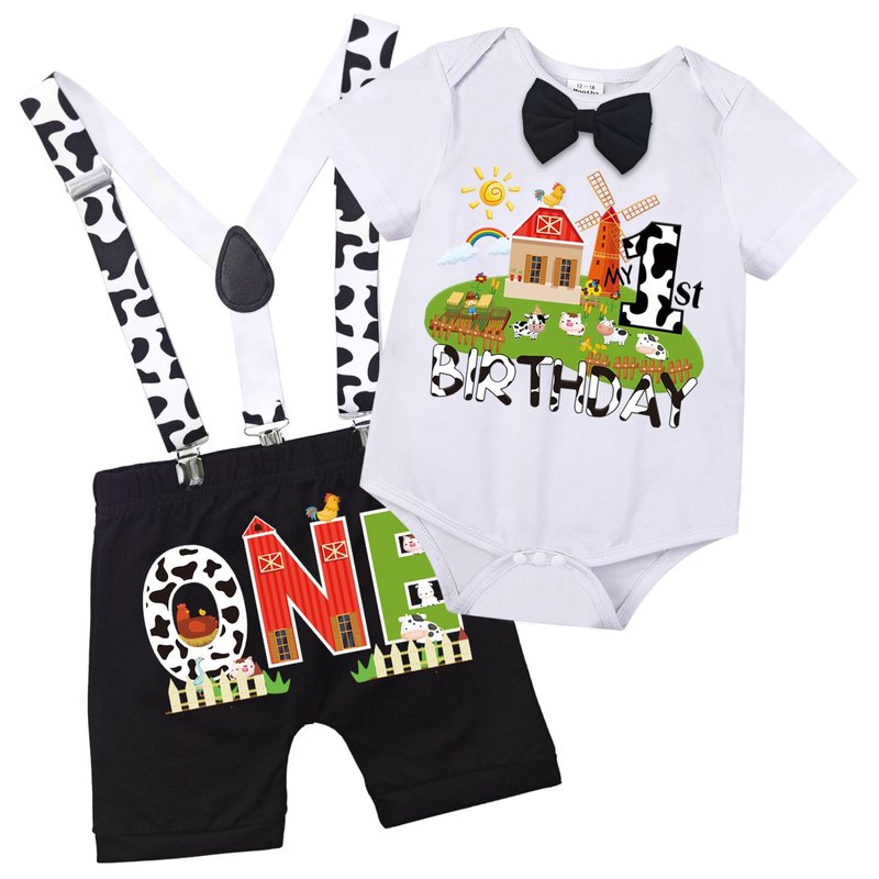 - Perfect gift for one-year-old baby: This cow first birthday bodysuit outfit is a perfect gift . The baby boy's top is designed with a spreadable envelope neckline. Paired with adjustable elasticated suspenders shorts, it will make your baby look handsome
