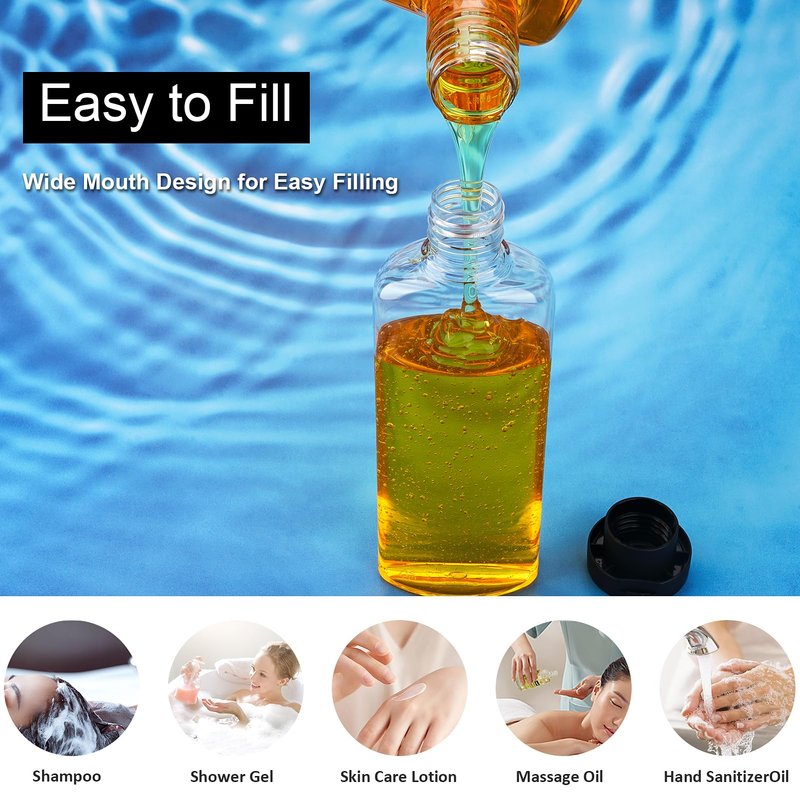 - Versatile Travel essentials: These travel bottles are perfect for a wide range of personal care products, including Hair Conditioner, Body Lotion, Facial Cleanser, Bath Shower Gels, Hair Shampoo, Liquid Hand Soap, Liquid Soap, and Facial Moisturizing Lotion. Plus, we provide waterproof label stickers for easy identification.