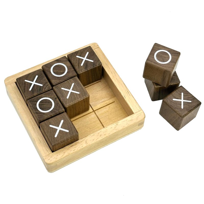 - Wooden XO game: Game tray with 3x3 grid in size 11X11CM. Walnut Game pieces with X or O symbols,each blocks size:3X3CM.