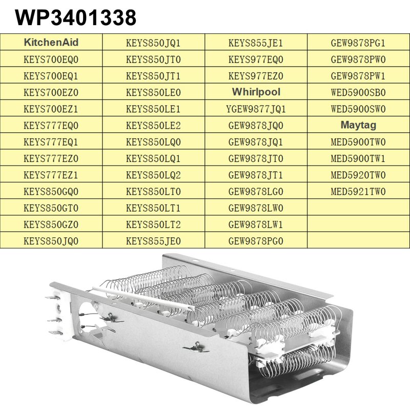 - 3 Wire Dryer heating element parts for kitchen aid maytag whirlpool dryers. WP3401338 WP8573069 3401338 8573069 dryer heating element replaces part numbers 528055 AP6008492 PS11741631 EAP11741631 1201501 AP6013455 PS11746681 EAP11746681.