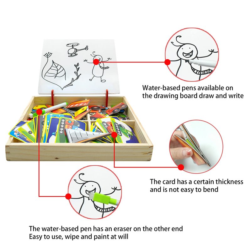 - ✅【Set includes】: Including 1 magnetic board(Magnetic wooden board on one side and whiteboard for drawing on the other)+ 55 puzzle accessories + 12 emoji template + 1 watercolor pen + 2 brackets + 1 storage wooden box.