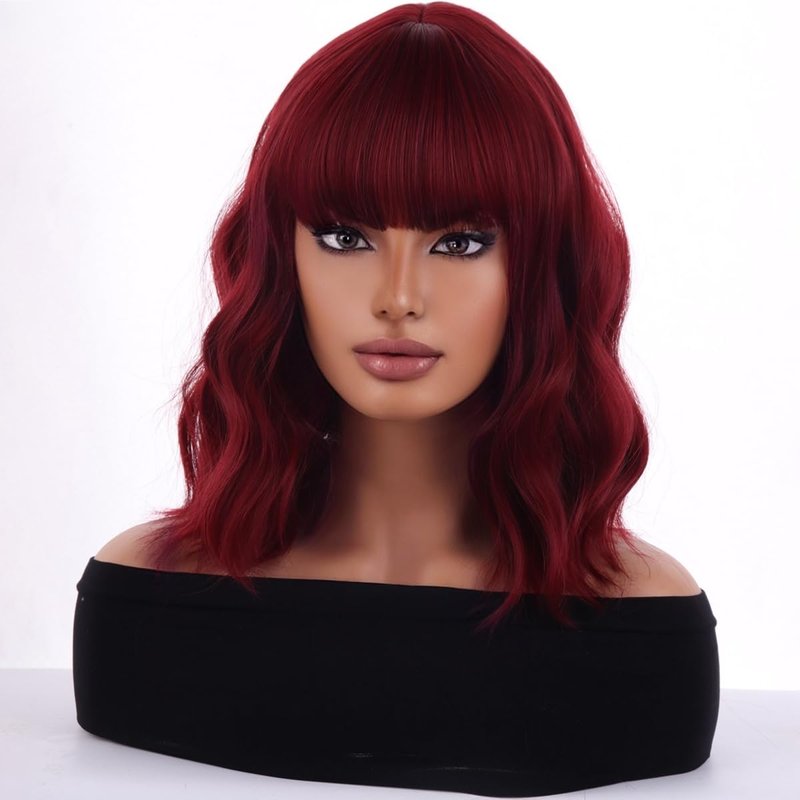 WTHCOS Wine Red Wig Short Bob Wig Short Curly Wavy Wig With Bangs for Women Burgundy Wig Heat Resistant Synthetic Hair Wigs for Daily Use Cosplay Wig With Wig Cap