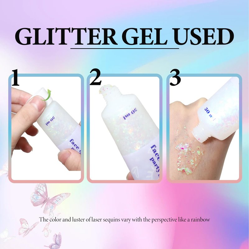 - White Body Glitter Gel and Butterfly Tattoos Set: Our holographic glitter set contains 50ml of glitter gel, this face glitter gel is made from large pieces of glitter in different shapes and sizes, and the color and gloss of the laser glitter allows you to glow from different angles. 30 sheets butterfly temporary tattoo stickers, available in different colors and styles. Use it anywhere you want and show your charm