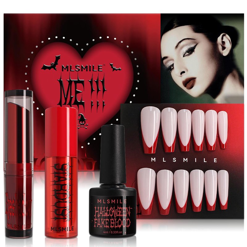 - Complete Halloween Makeup Kit for Women & Girls: Our Halloween makeup kit boasts a four-piece set, a two-tone eye shadow stick, fake blood cream, powder lipstick &12 pcs press on nails. Suitable for all skin types, it offers a versatile range to match your Halloween costume flawlessly