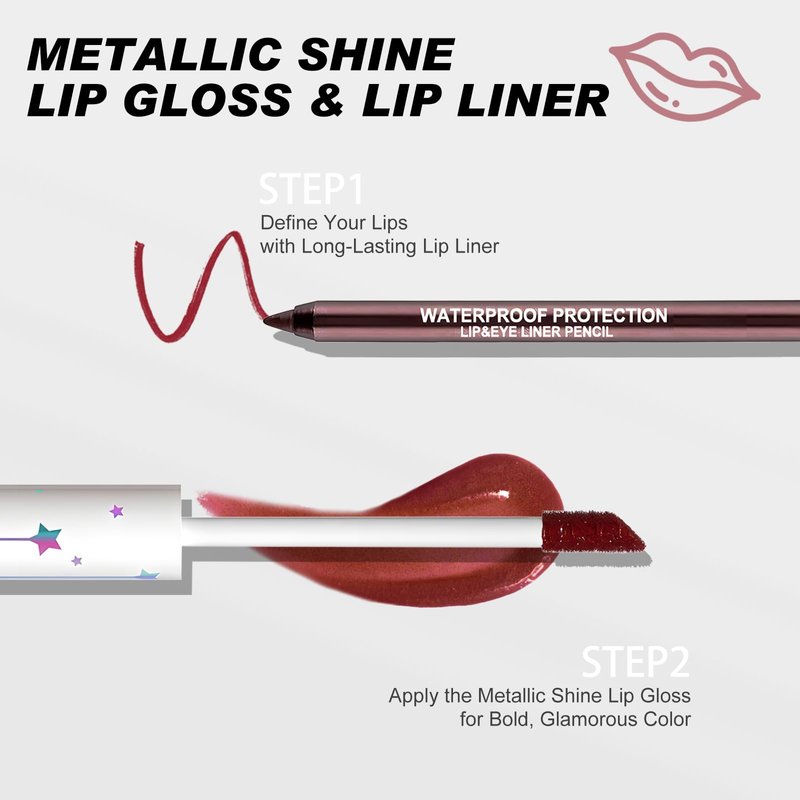 - Effortless Application: Achieve professional-looking lip art in just a few steps with our Lip Liner and Lipstick Combo. Effortlessly outline your lips with the Lip Liner Pencil, then fill in with the matching Metallic Liquid Lipstick for a seamless blend