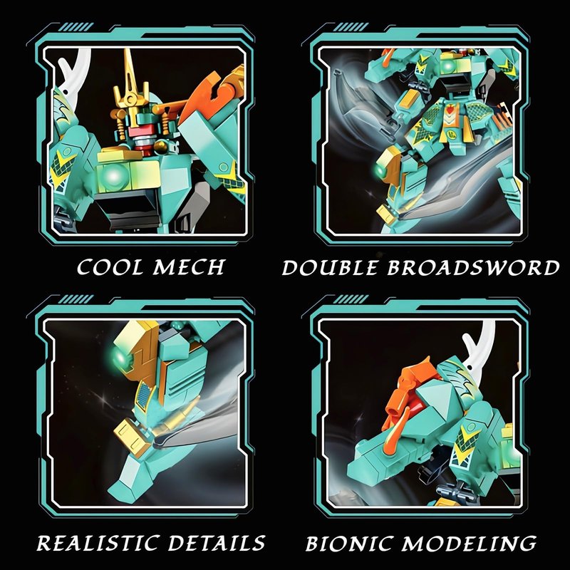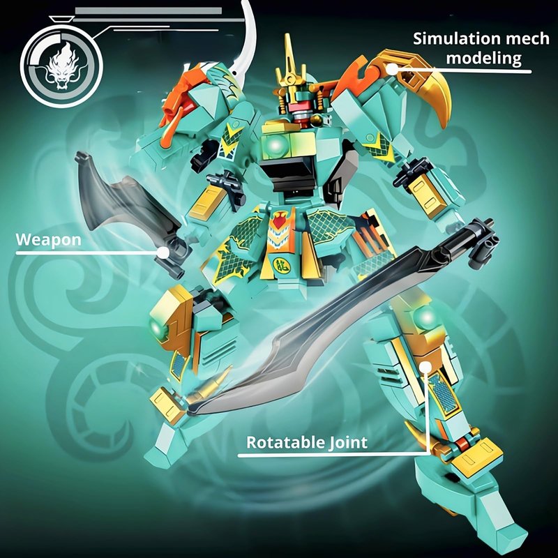 - Green Dragon Samurai Mech Kit: The spirit beast mech set inspired by mythological scenes. The combination of green and gold creates an amazing visual impact. Includes 321 blocks and clear instructions, making assembly easy for both teenagers and adults