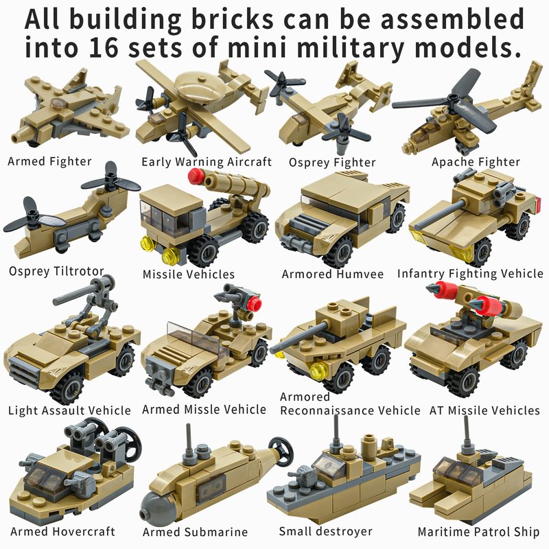 √. Not only army toys compatible with Lego military, but also STEM building bricks toys. Each toy vehicle needs to be assembled by your children, which is more fun.