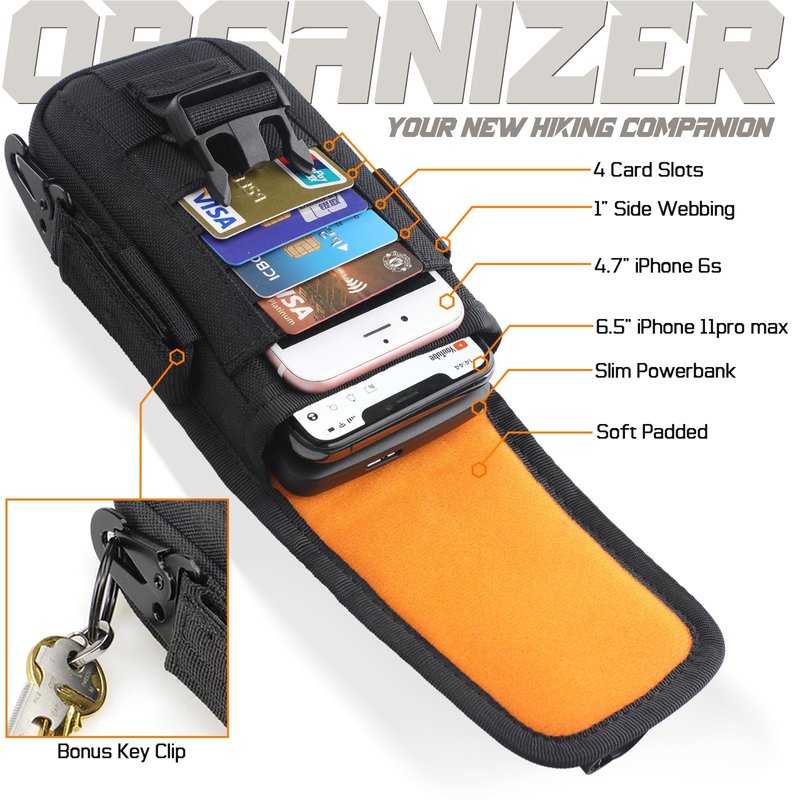 - LARGE DOUBLE CAPACITY: Molle phone holder features two compartments, available to hold two cell phones or cash. 4 card slots allow you storage small tools ID card and credit card, receipts, or some cash while on the go. Dimensions: 18cm(H)*10.4cm(W)*6cm(T)/6.5"(H)*4.1"(W)*1.5"(T).
